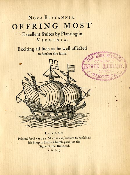 Nova Britannia, title page, By Robert Johnson, fl. 1586–1626, supposed author (New York, Printed for J. Sabin, 1867) Special Collections, F229.J676, Library of Virginia, Richmond, Virginia.